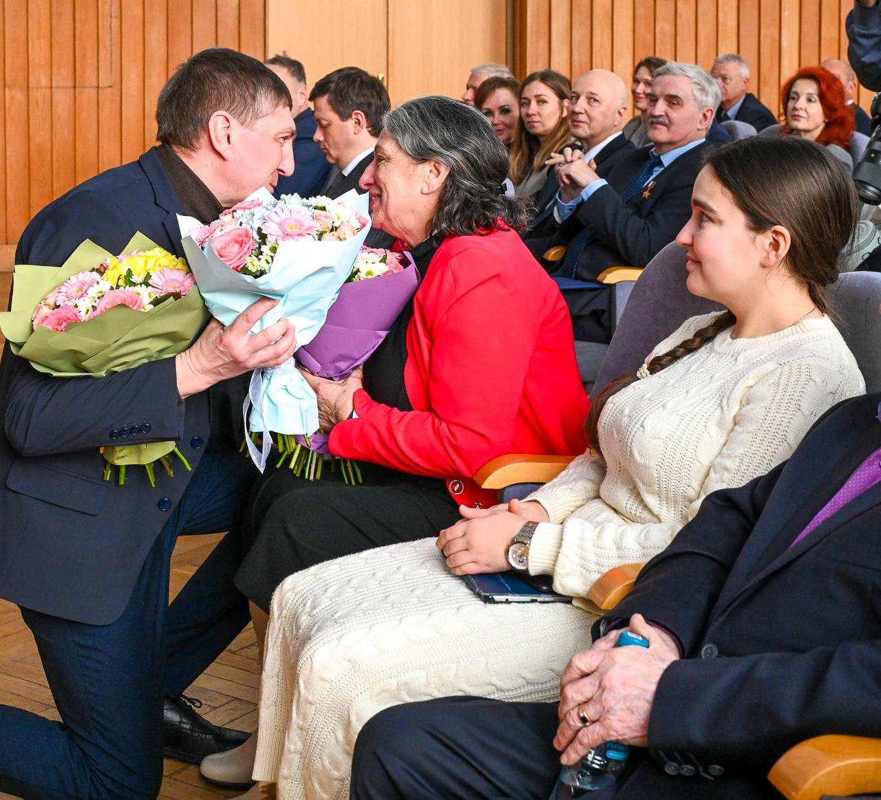 Сергей Константинович Крикалёв, заместитель генерального директора по пилотируемым программам Госкорпорации «Роскосмос», Герой Советского Союза, Герой России, лётчик-космонавт СССР также поздравил российских членов экипажа с успешным завершением программы полёта и вручил им ведомственные награды.