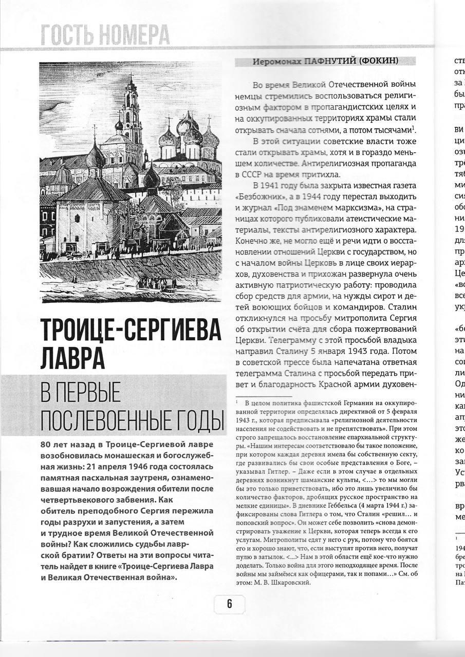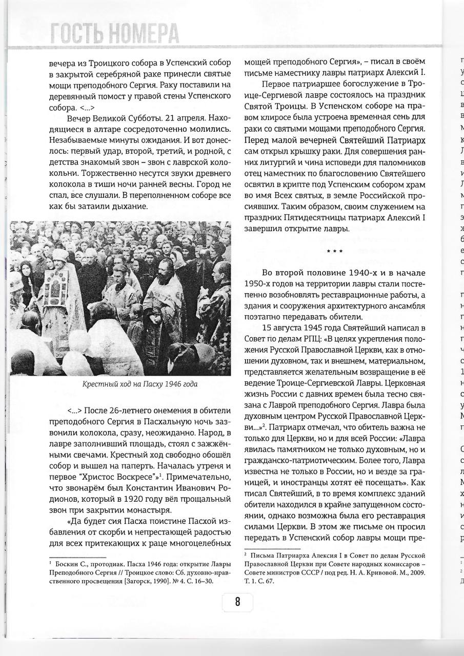 21 апреля 1946 года состоялась памятная пасхальная заутреня, ознаменовавшая начало возрождения обители после четвертьвекового забвения. Как обитель преподобного Сергия пережила годы разрухи и запустения, а затем и трудное время Великой Отечественной войны? Как сложились судьбы лаврской братии?